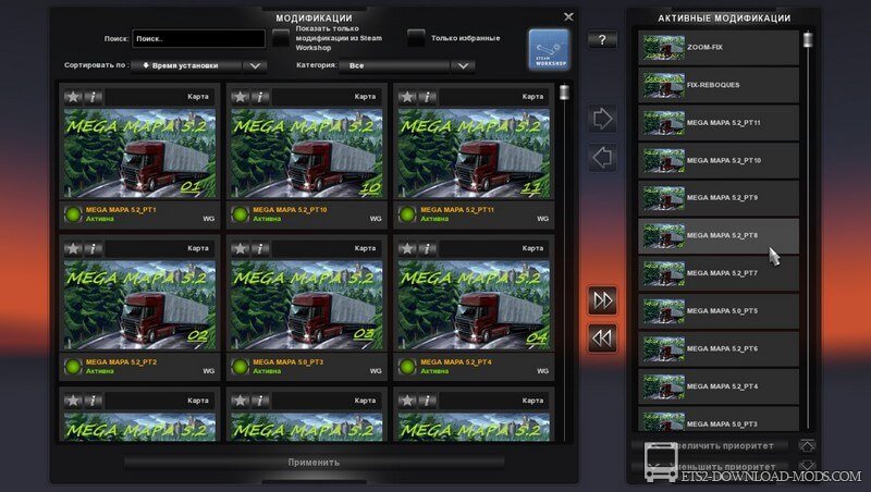 Установка карты имеет свои нюансы. Вы получаете четыре файла с названиями mega_mapa_5.2.7z.001, mega_mapa_5.2.7z.002, mega_mapa_5.2.7z.003, mega_mapa_5.2.7z.004. Они должны находиться в одной папке. Нажав на первый из них, выбираем в архиваторе «Распаковать здесь» и ждем пока все файлы будут извлечены. Получится одиннадцать файлов модификации с названиями «х»-MM_5.2.scs, где «х» - это номер по порядку и файл ZOOM.scs. Все эти файлы мы уже копируем в папку mod вместе с файлом CARGAS_FIX.scs из последнего архива. При подключении в менеджере модов каждый из тринадцати файлов должен располагаться в строго заданном порядке, иначе карта Mega Map 5.2 для Euro Truck Simulator 2 не будет запускаться, вызывая фатальные ошибки в работе игры. Порядок расположения следующий: