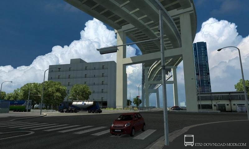 Но после установки модификации и даже беглого ознакомления с новыми местами становится понятно, что территория не такая уж и маленькая и вы найдете где развернуться. Токийский мегаполис отличается насыщенностью дорожных развязок и большим количеством транспорта. Такие же составляющие попытался воссоздать автор модификации, проработав города до самых незначительных на первый взгляд мелочей. Воссозданы целые микрорайоны с большим числом построек. Все они очень разнообразны и нет двух одинаковых зданий. Увы, карта Tokyo Bayshore v.1.2.4 для Euro Truck Simulator 2 сделана автономной и поэтому нужно создавать новый игровой профиль для прохождения этой модификции, выбрав модуль wangan.mbd на самом старте. Всего архив состоит из четырех функциональных частей и каждая из них отвечает за свою составляющую.